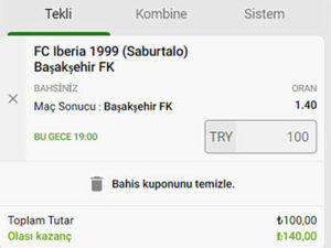Aşağıdaki örnekte; FC Iberia 1999 – Başakşehir FK maçında “Maç Sonucu: Başakşehir FK” seçimine 1.40 orandan 100 TL değerinde bahis yapılmıştır. İlgili bahisin gerçekleşmesi hâlinde elde edilebilecek olası kazanç görülmektedir: 140 TL.